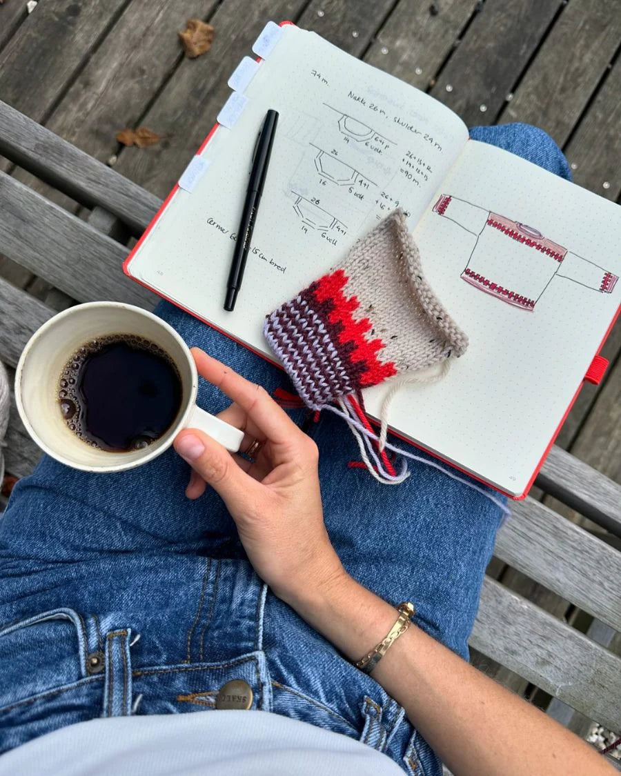 Der Pullover wird von oben nach unten gestrickt und zeichnet sich durch eine markante Borte aus gestrickten Kreuzen auf der Passe sowie entlang der Kanten an Ärmeln und Rumpf aus. Die Konstruktion ist durchdacht und nahtlos, wodurch ein gleichmäßiges Maschenbild und eine saubere Passform entstehen.