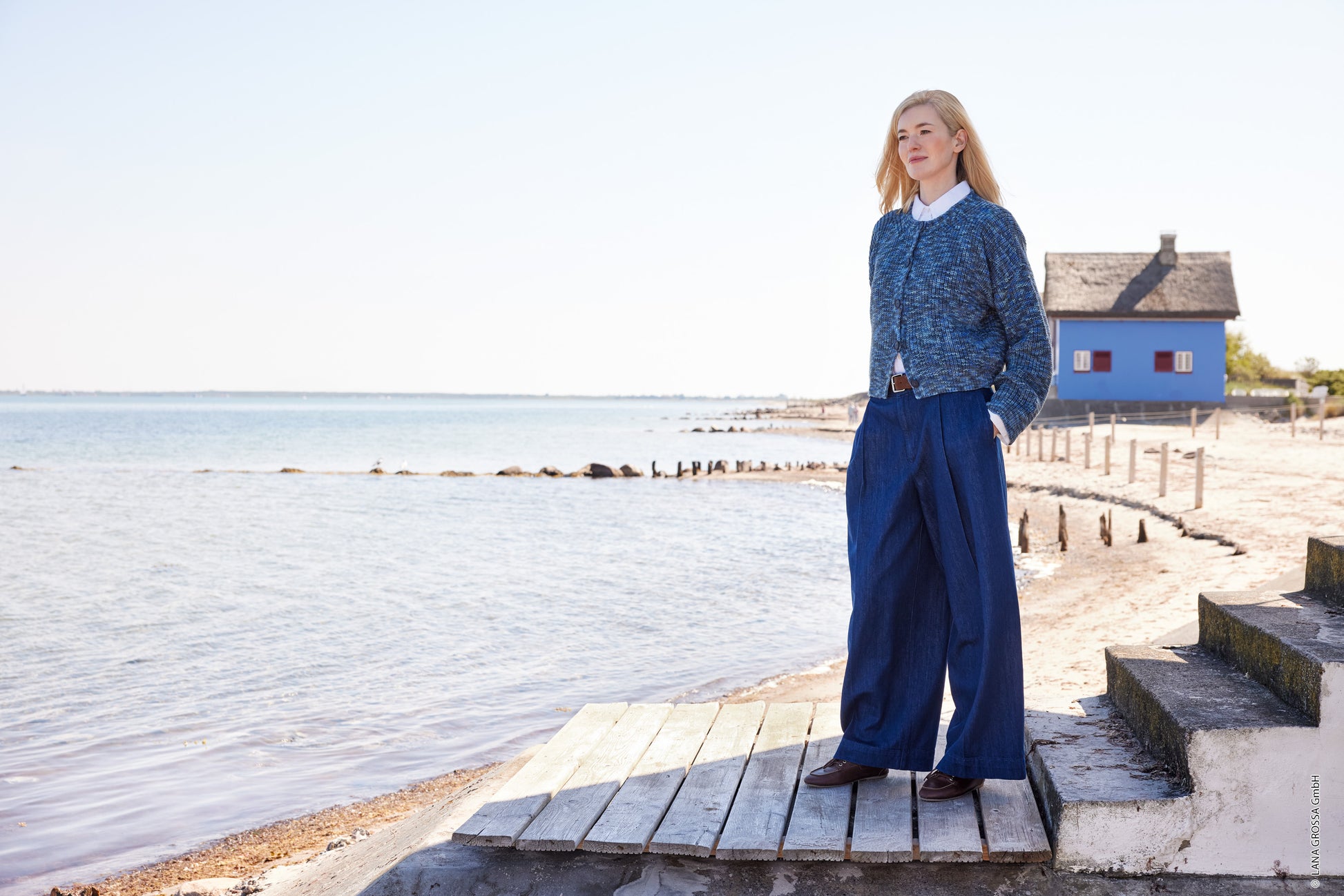 Die „Cool Wool Print“ Merinowolle überzeugt durch ihr feines Maschenbild und die fließenden Farbverläufe in Blautönen – von Jeans über Graublau bis Royal. Das macht jedes Modell zu einem Unikat. Die Jacke hat eine klassische, leicht taillierte Form und ist ideal für Übergangszeiten oder als leichte Strickjacke im Büro oder Alltag.