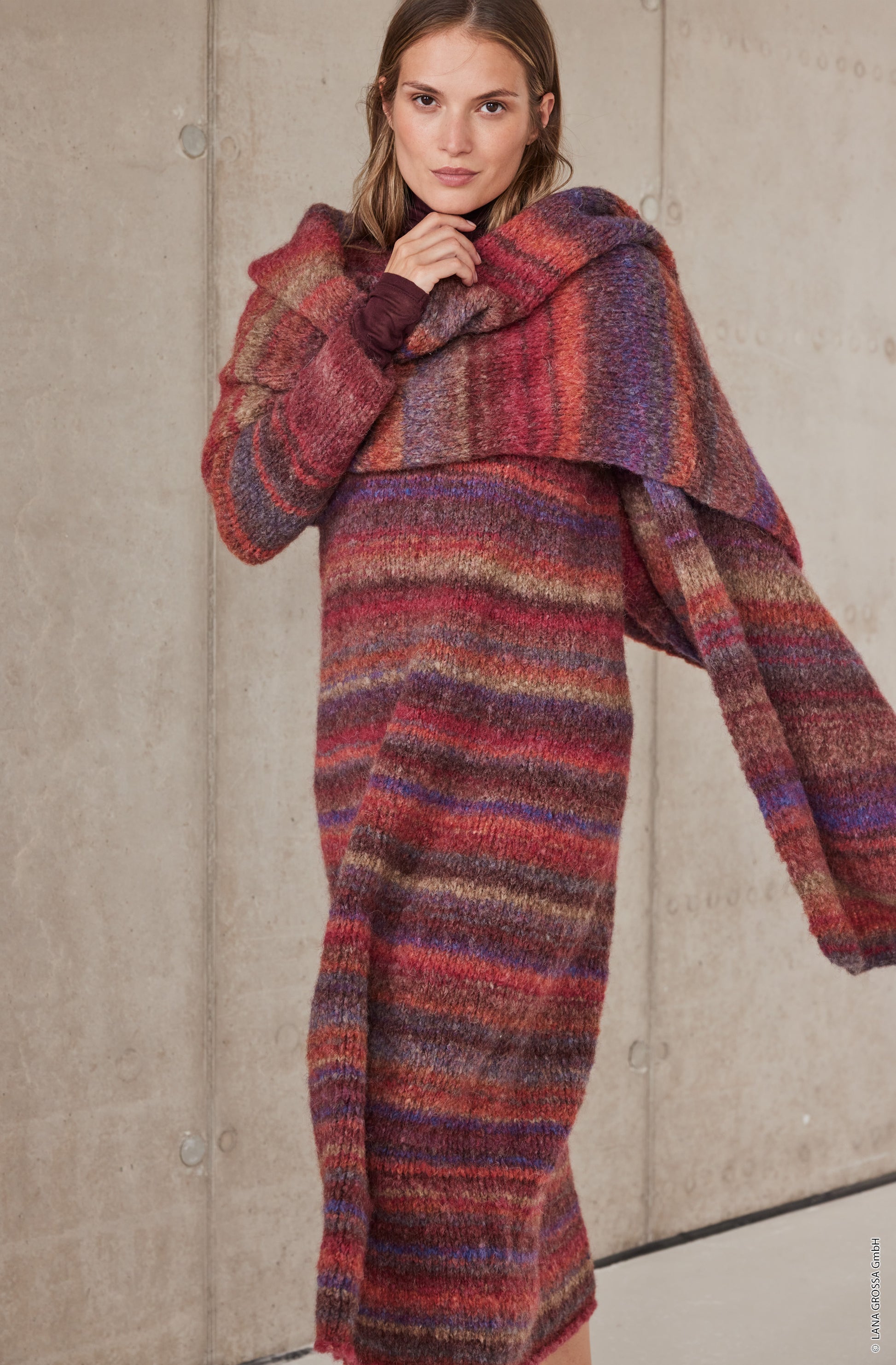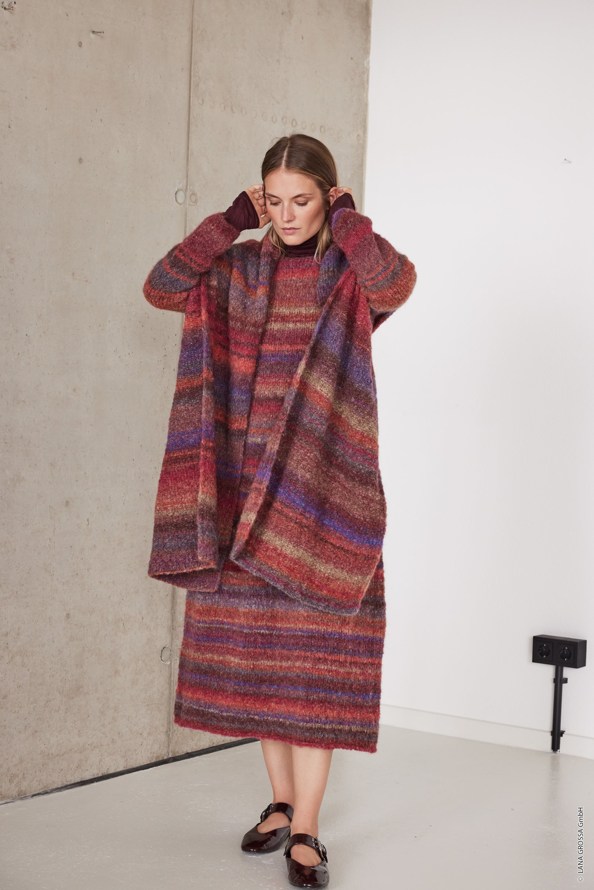 Das Strickkleid Gigante Multi ist ein echter Hingucker: Die ausdrucksstarke Farbkomposition in Weinrot, Rotbraun, Aubergine, Khaki und Grautönen macht jedes Modell zu einem Unikat. Gestrickt aus der luxuriösen Qualität Lana Grossa Gigante Multi mit hohem Alpaka-Anteil überzeugt das Kleid durch seine Leichtigkeit, Wärme und weiche Haptik. Das glatte Rechtsmuster bringt den mehrfarbigen Verlauf perfekt zur Geltung, während der feminine Schnitt ein modernes, gemütliches Tragegefühl schafft.