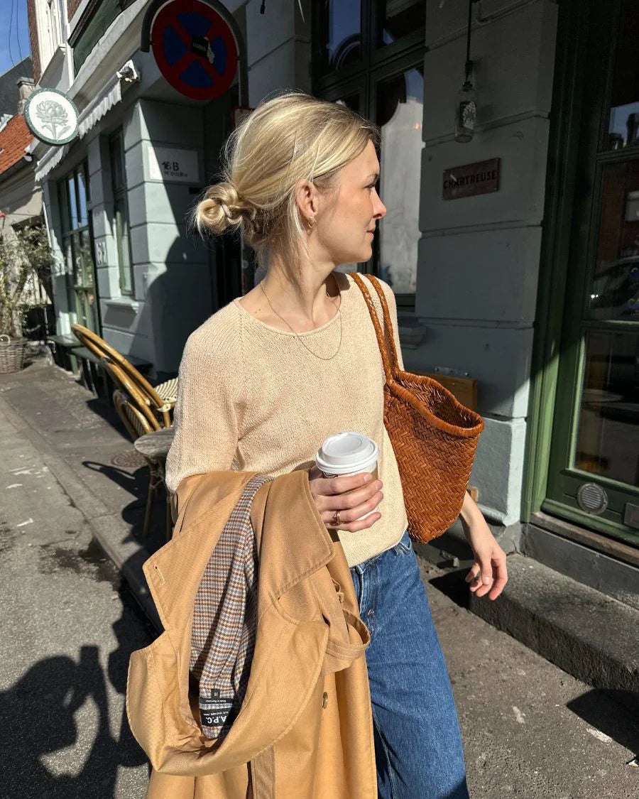 Das Kumulus Tee O‑Neck wird glatt rechts von oben nach unten gestrickt und hat einen klassischen, runden Halsausschnitt. Die Kanten sind mit eleganten I‑Cord‑Abschlüssen versehen, was dem Shirt einen hochwertigen Look verleiht. Das Modell wird nahtlos gearbeitet – es ist kein Zusammennähen erforderlich.