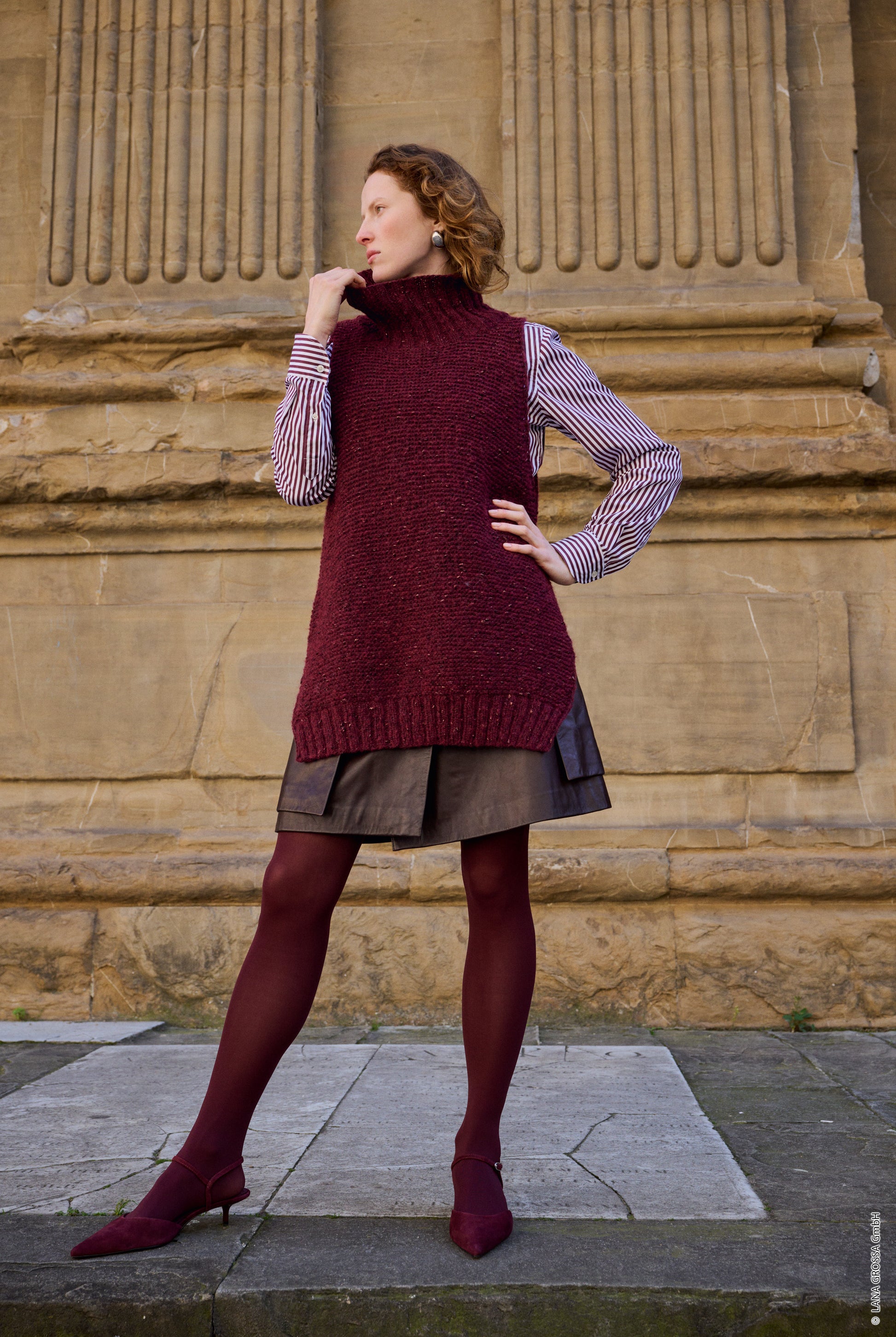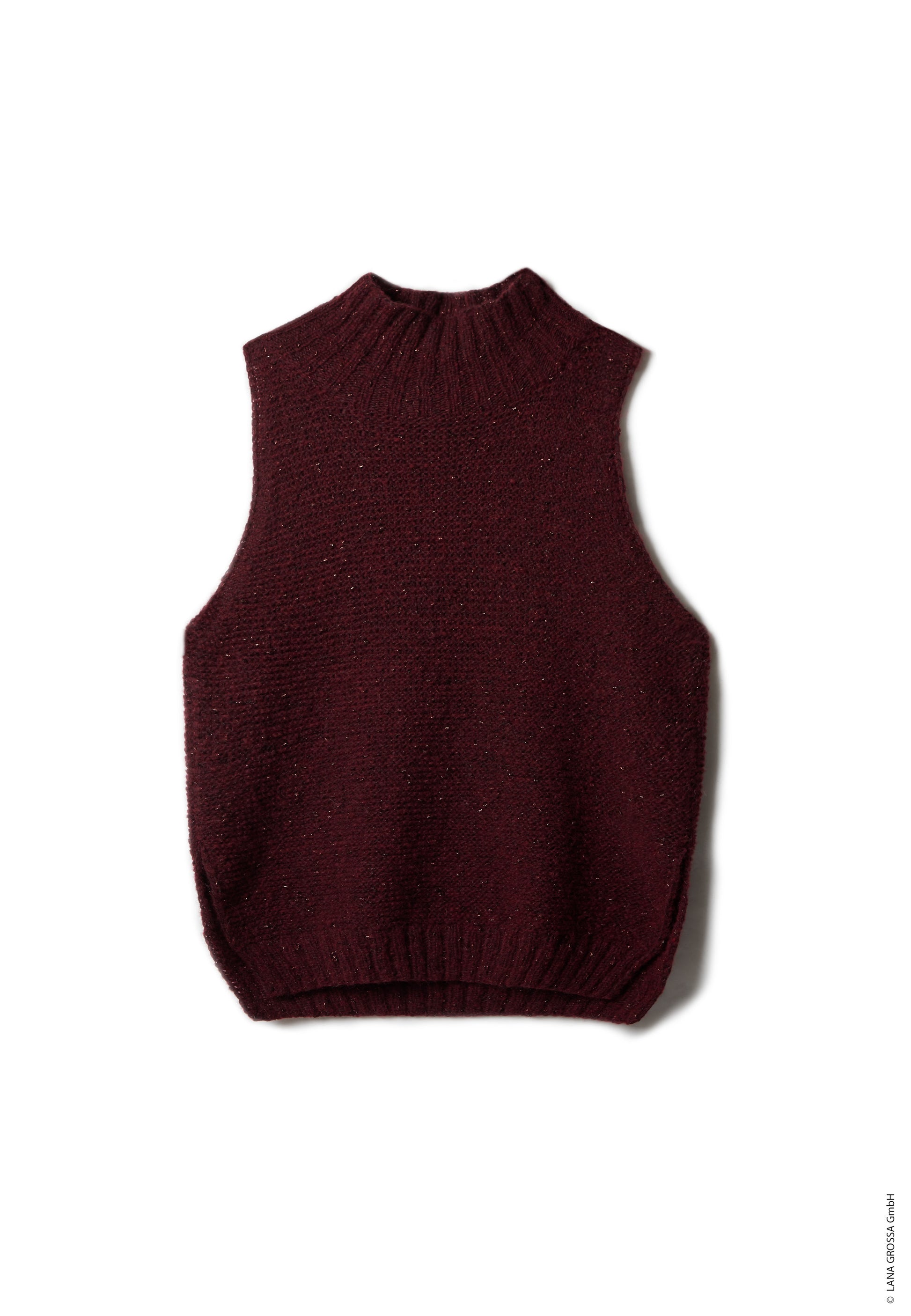 Der Long-Pullunder Lucciola ist ein modisches Strickstück mit lässiger Länge und subtilen Glanzeffekten. Das Garn Lana Grossa Lucciola kombiniert Merinowolle, Baby-Alpaka, Viskose und Polyamid mit einem zarten Anteil an metallischen Fasern, wodurch ein schimmernder Look entsteht. In Schwarzrot gestrickt, wirkt der Pullunder sowohl elegant als auch modern – perfekt für Kombinationen mit Blusen, Kleidern oder schmalen Hosen.