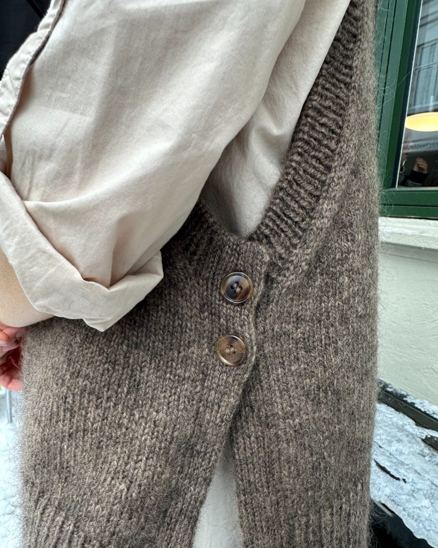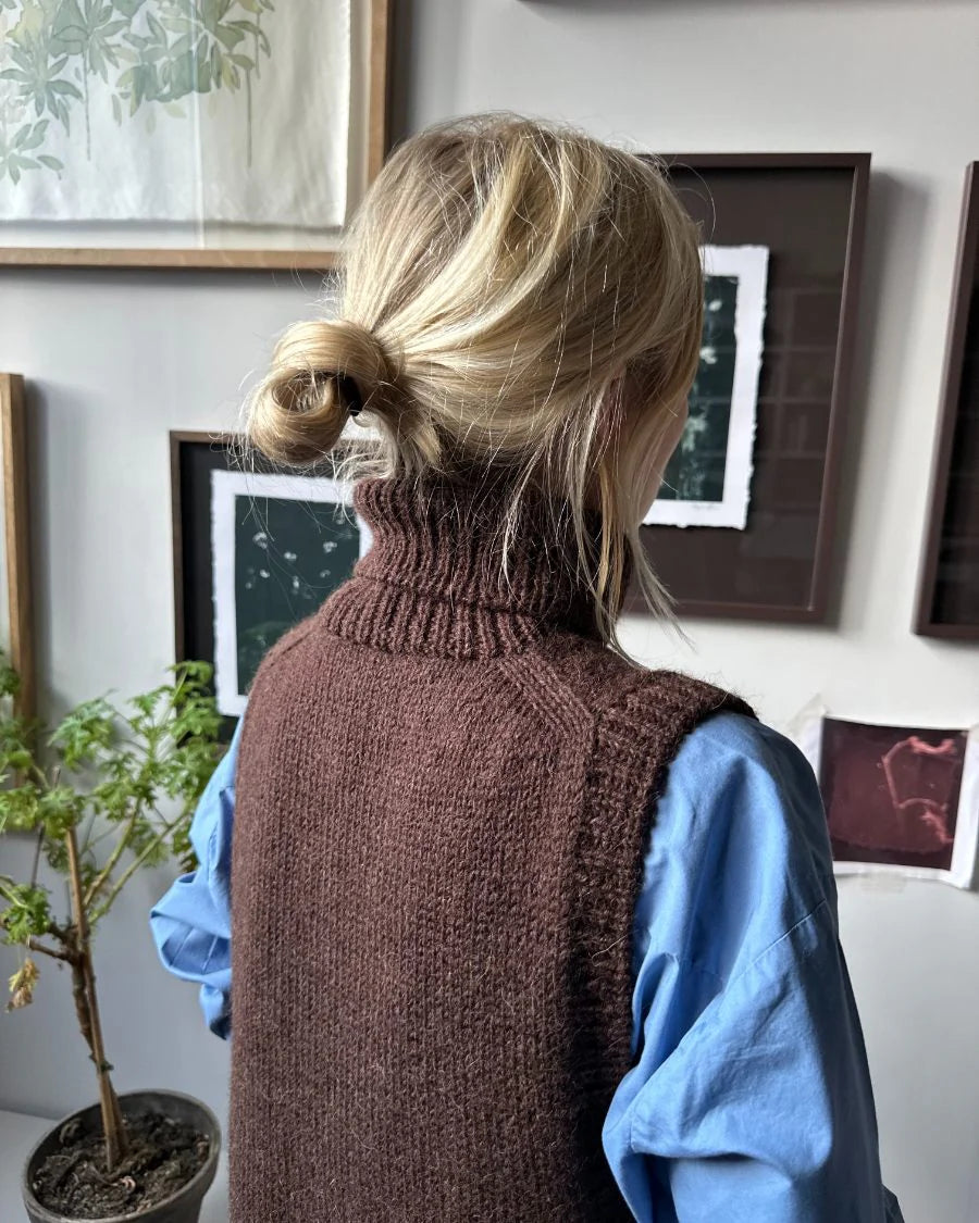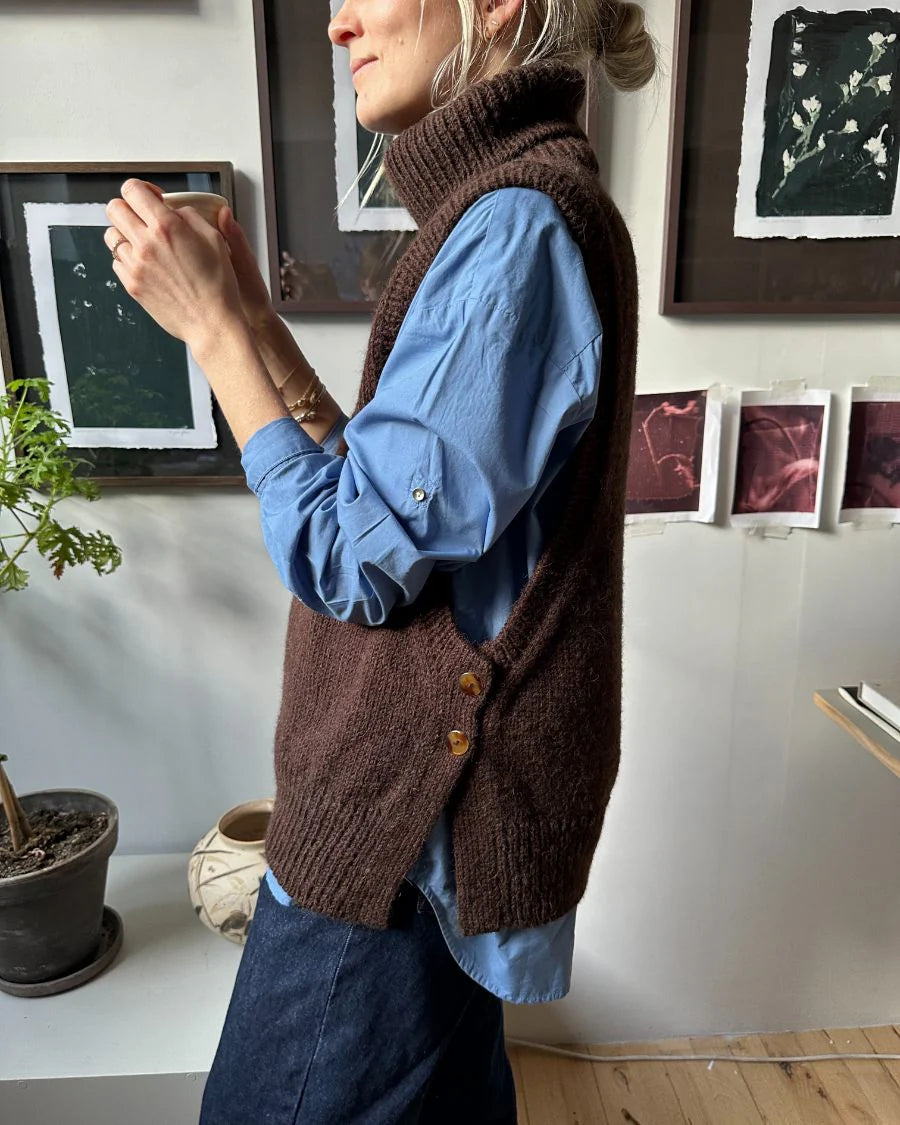 Der Lulu Slipover – Chunky Edition ist die markante, winterliche Variante des Klassikers. Tiefe Armausschnitte, seitliche Schlitze mit Knöpfen und ein voluminöser Rollkragen treffen auf eine klare, reduzierte Silhouette. Der Pullunder wird nahtlos von oben nach unten gestrickt und eignet sich ideal als Layering-Piece über Blusen, Shirts oder Kleider.