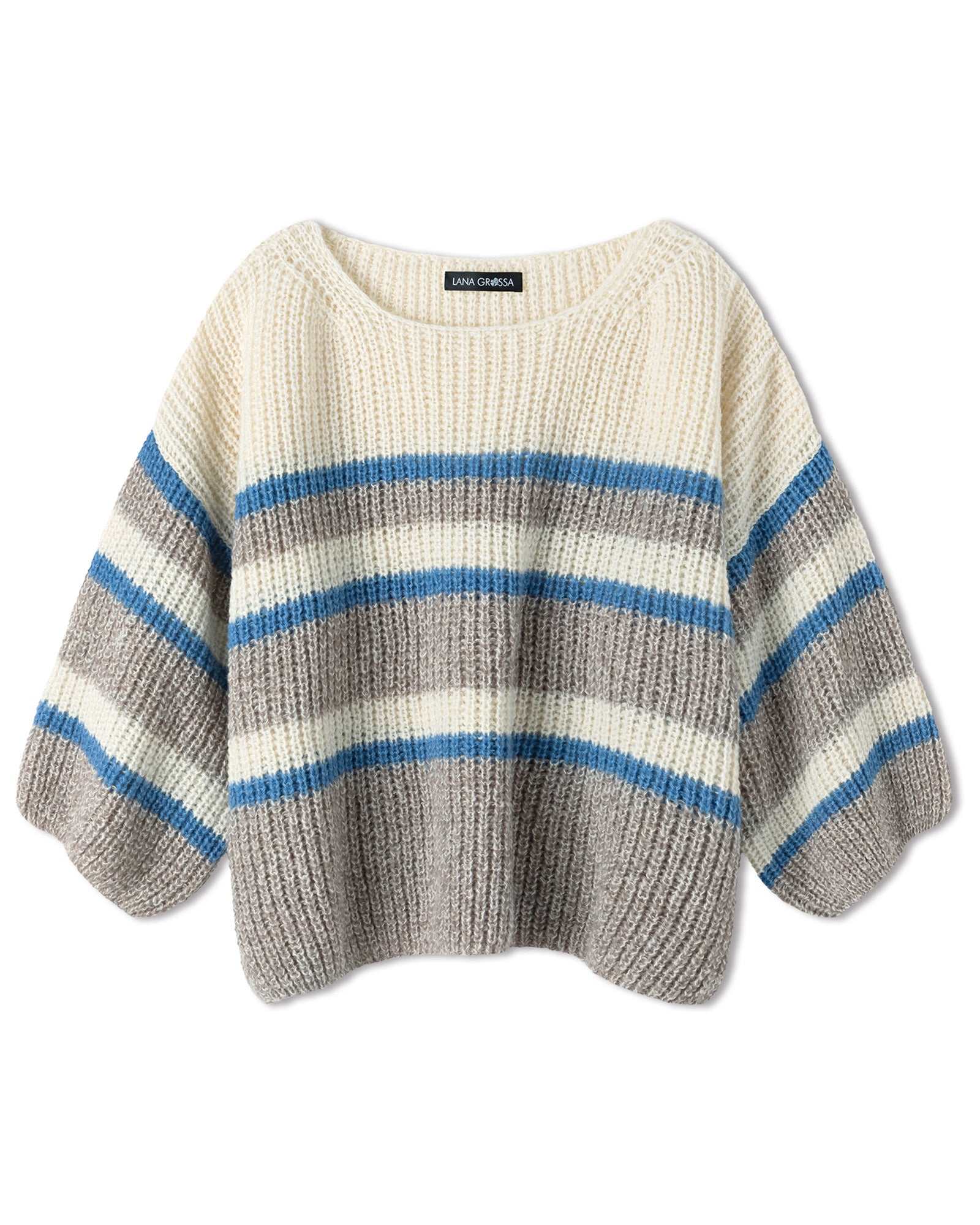 Der „Pullover Soffio“ vereint einen natürlichen Charme mit luxuriösen Materialien. Die Kombination aus extrafeiner Merinowolle, Bio-Baumwolle und Kaschmir fühlt sich wunderbar soft an und hält zugleich angenehm warm. Durch das Halbpatentmuster entsteht ein markantes Strickbild, das den Farbwechsel zwischen Rohweiß, Taupe und Himmelblau eindrucksvoll zur Geltung bringt.