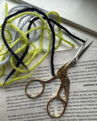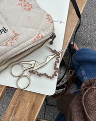 Goldene Stickschere mit Storchenmotiv. Die Schere ist aus rostfreiem Stahl und hat die perfekte Größe für Deine Projekttasche.