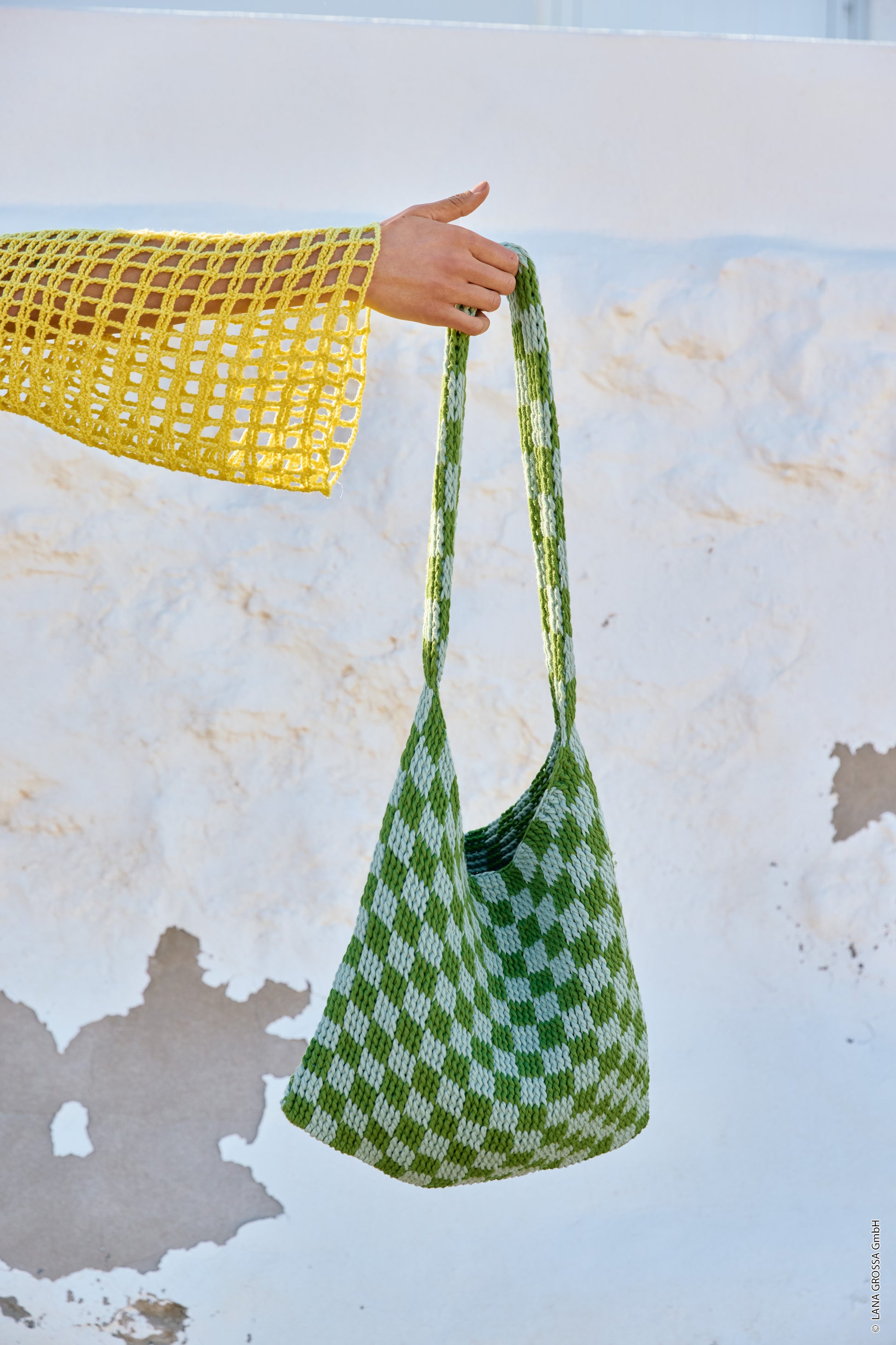 Gehäkelt wird mit dem Garn „Promessa“ von Lana Grossa – einer innovativen Mischung aus Bio-Baumwolle und recyceltem Polyamid. Das Ergebnis: ein robustes, formstabiles und angenehm griffiges Material – ideal für Taschen und Accessoires.