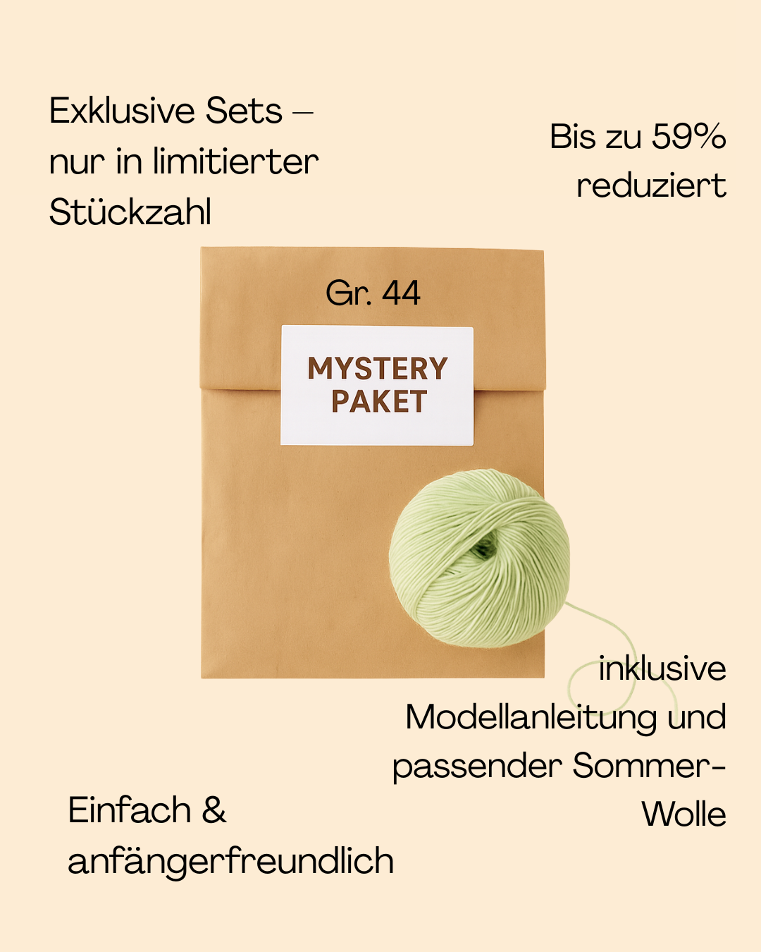Du liebst Überraschungen und suchst nach deinem nächsten Strickprojekt? Mit unseren exklusiven Mystery Modellpaketen bekommst du alles, was du für einen leichten Sommerpulli brauchst – und das zu einem unschlagbaren Preis, bis zu 59% reduziert.