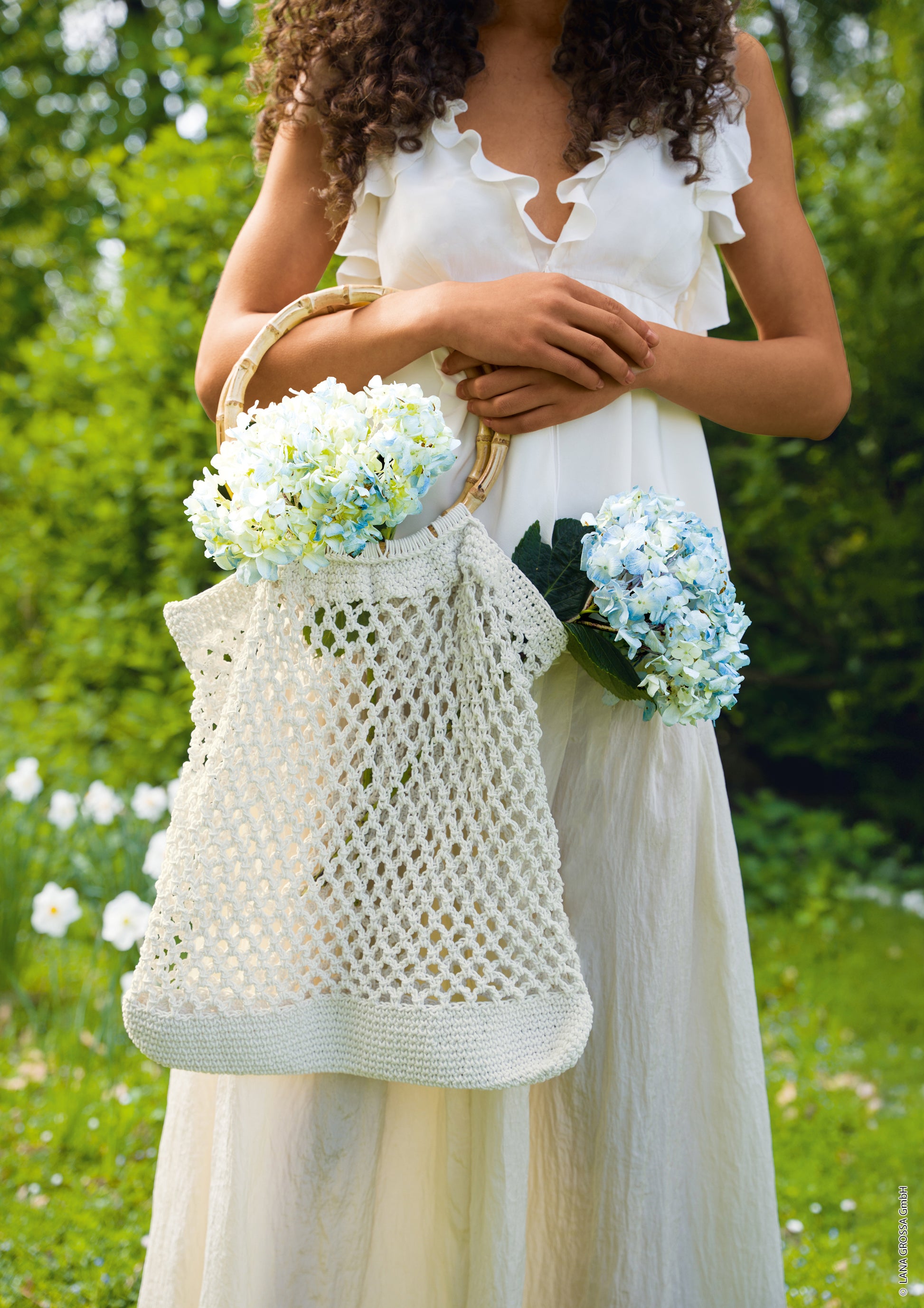 Die abgebildeten Bambusgriffe (Ø 22 cm, Prym Art. 616111) sowie die Häkelnadel Nr. 4,5–5 gelten als zusätzliches Zubehör und sind nicht im Modellpaket enthalten.