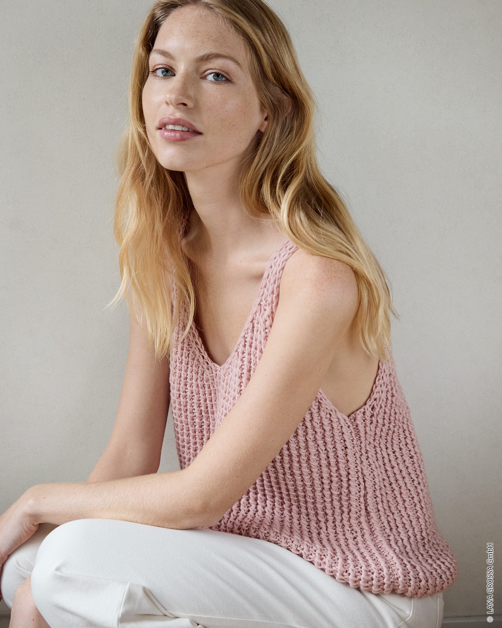 Ob solo getragen oder unter einer leichten Strickjacke – dieses Top ist ein perfektes Basic für den Sommer. Die Anleitung ist auch für ambitionierte Stricker:innen gut umsetzbar, da das Rippenmuster einfach zu stricken ist und dennoch eine raffinierte Optik bietet.