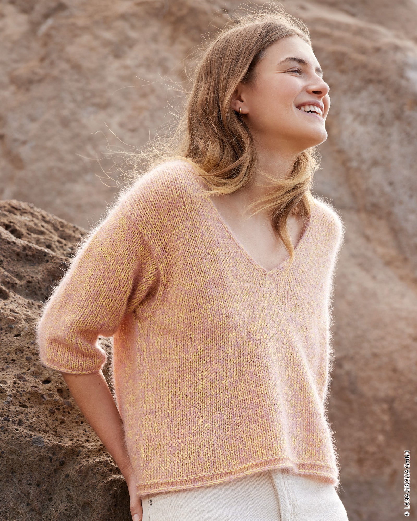 Stricke dir jetzt den „V-Pullover Summer Cashmere & Silkhair (Natural Knits 01)“ und erlebe den Komfort und die Eleganz feinster Naturgarne!